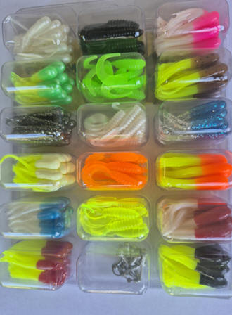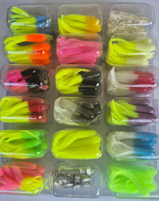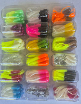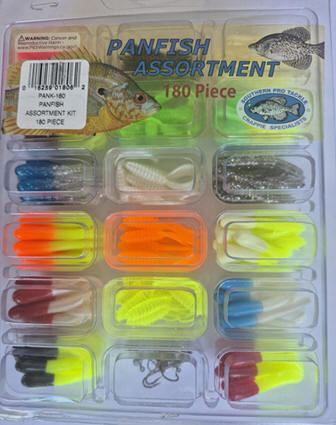SOUTHERN PRO PANK-180 PAN FISH ASSORTMENT - This is the Southern Pro 180pc Pan fish assortment, this kit comes with 12 colors of 10 ea. of the 1.5" Lit'l hustlers and 5 colors of the teaser tails. Plus 10 round heads. These kits change every once in a while they use to have bream bugs and tiny worms but this one dose not. I the picture the hustlers are on the 2 sides and the teaser tails are in the middle row.