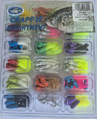 SOUTHERN PRO SHK-180 SCALEHEAD ASSORTMENT -This is the Southern Pro 180pc Scalehead Lit'l hustler kit. This kit comes in 17 colors of 10 each,, Plus 10 minnow heads, Colors may vary.