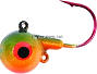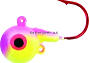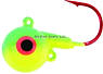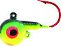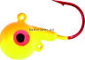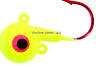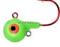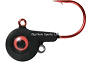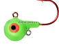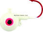 Round-head style jig with short shank blood red hook. UV glow red eyes and chip resistant finish. Extra eyelet to accommodate stinger hooks or blades.